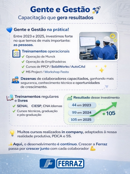 Na Ferraz, acreditamos que capacitação profissional na indústria é a base para resultados consistentes e crescimento sustentável. Por isso, investir em gente e gestão faz parte da nossa estratégia, unindo desenvolvimento humano, qualificação técnica e excelência operacional.