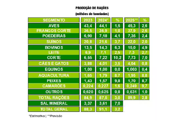A projeção do Sindirações é de que a produção total atinja 90 milhões de toneladas ao final de 2025, crescimento estimado em 2,8%. Esse avanço reflete exclusivamente o desempenho do segmento de rações, uma vez que os dados de sal mineral ainda não foram totalmente consolidados.
