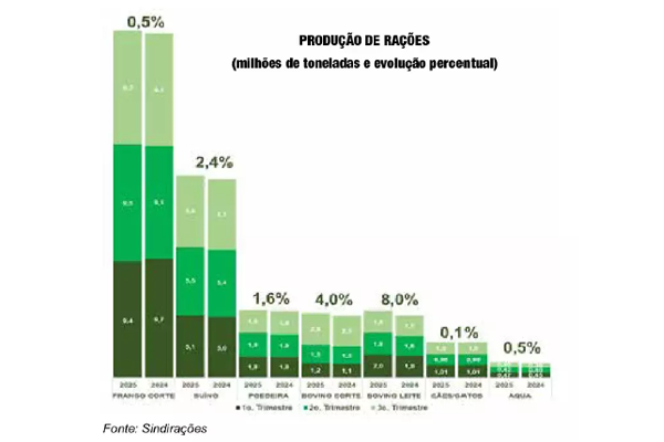 O Sindicato Nacional da Indústria de Alimentação Animal (Sindirações) anunciou a prévia do balanço do setor referente aos nove primeiros meses de 2025, indicando que a indústria brasileira de alimentação animal alcançou 66,5 milhões de toneladas de rações entre janeiro e setembro, o que representa um crescimento de 2% em relação ao mesmo período de 2024.